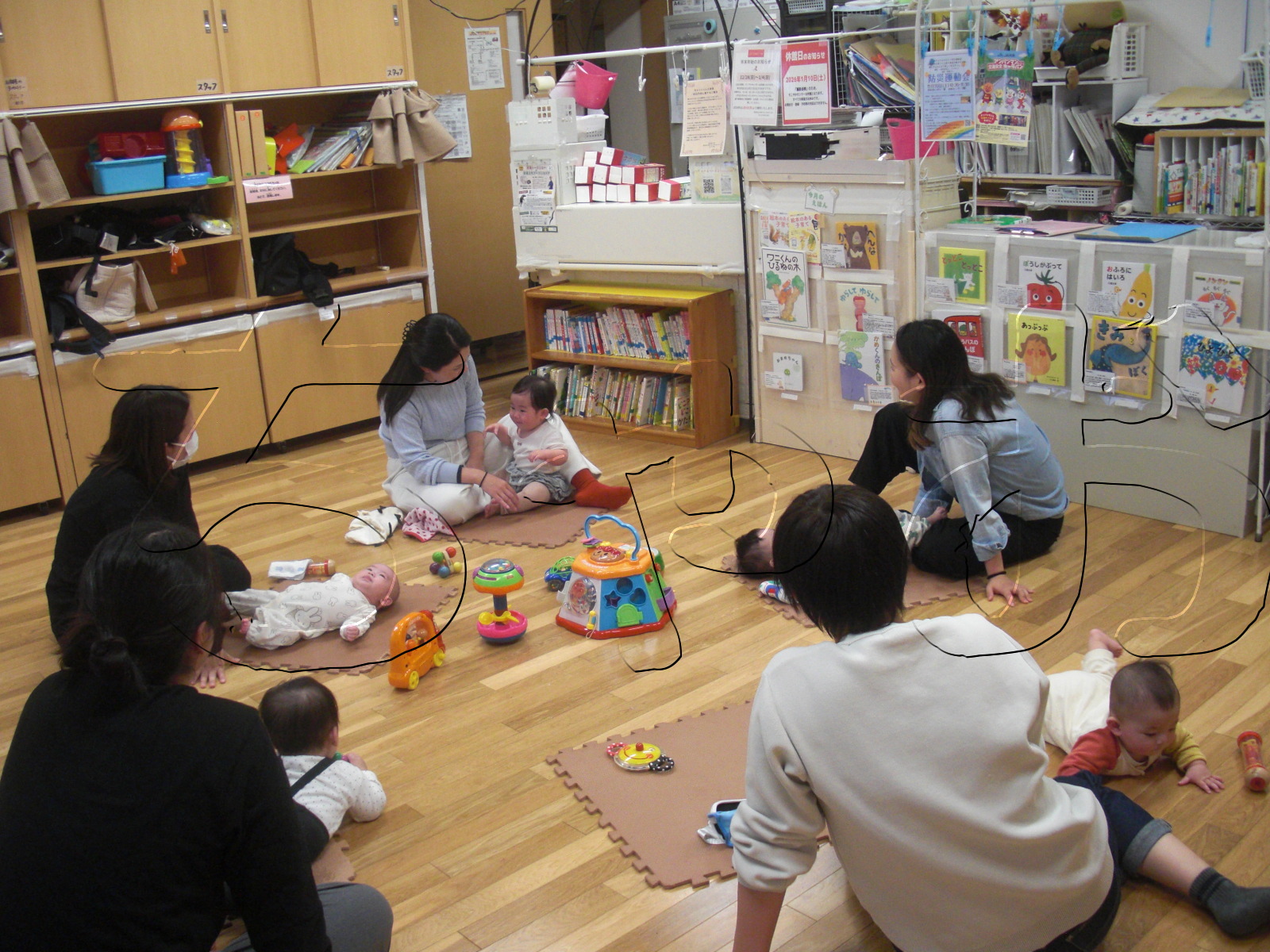 午後は、5組遊びに来られました。 遊びながら、絵本の紹介をたくさんしたところ、お母さんのお膝に座って、優しい声での読み聞かせ会が始まりました。指差しや声を出して、お子さんもとても喜んでいました。 だっこひろばでも、鯉のぼりを作りました。シールが指についても、根気よく頑張って作ってくれました。お部屋にたくさんの鯉のぼりが増えました。鯉のぼりさんも嬉しそうです。ありがとうございました。