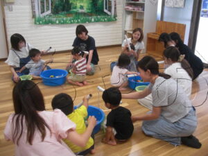 午前は「ぱんだクラス」の6回目でした。「もりのなかで」のダンスは、お部屋に貼ってある動物のパネルを探しながら元気に踊ってくれました!!玉入れ、パラバルーンもしました。パラバルーンでは、しっかり持って歩いたり上にあげたり、中に入ったりとっても楽しんでくれていました。お母さん同士もお話されたりこどもたちの関わりも増えていますね。