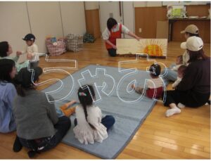 午後は「ひつじクラス」の8回目でした。ダンスやロープ体操、手遊びをしました。「おおきなかぶ」のお話しでエプロンシアターを使ってこどもたちも前に出てきて引っ張ってもらいました。絵合わせカード遊びでは、「のりもの」「どうぶつ」シリーズで遊びました。これは「○○」と言いながら組み合わせを探してくれました。ロープ体操では、ロープを持って回したり、ロープを踏まずに飛んだり、ロープの上を歩いたりとみんな上手でした。