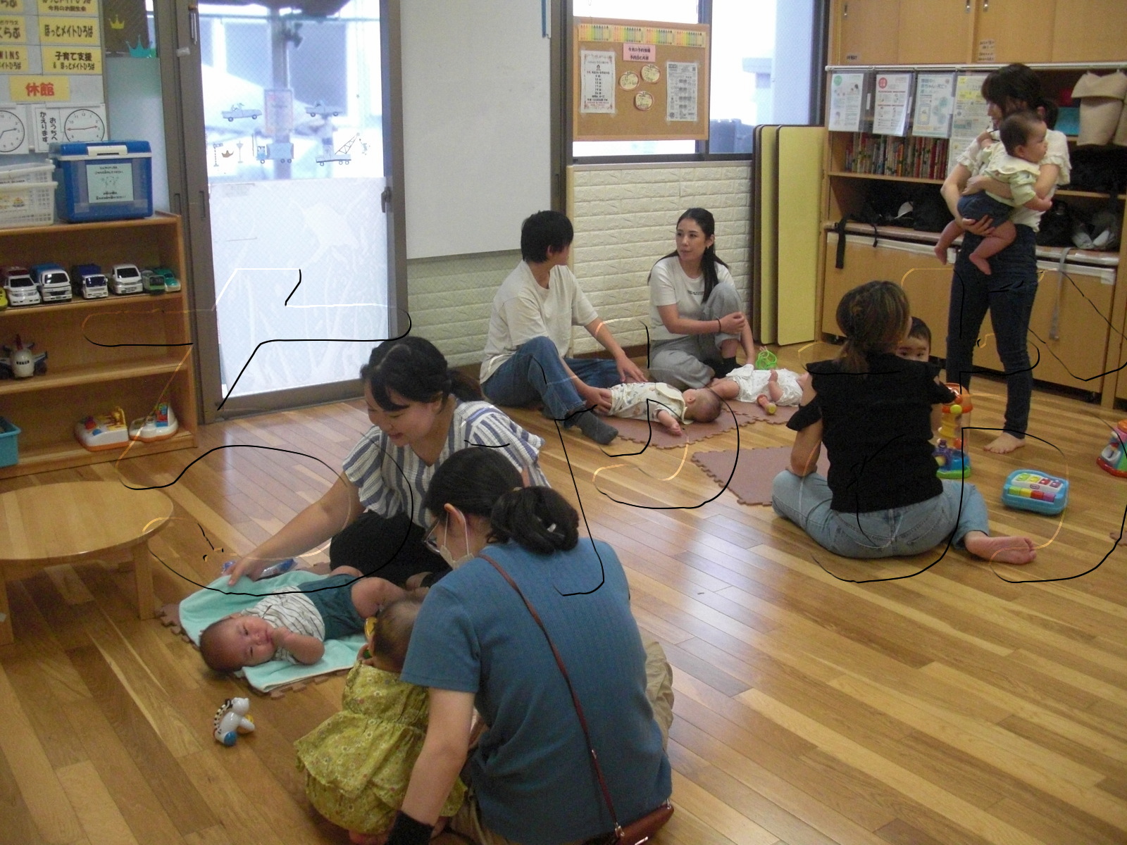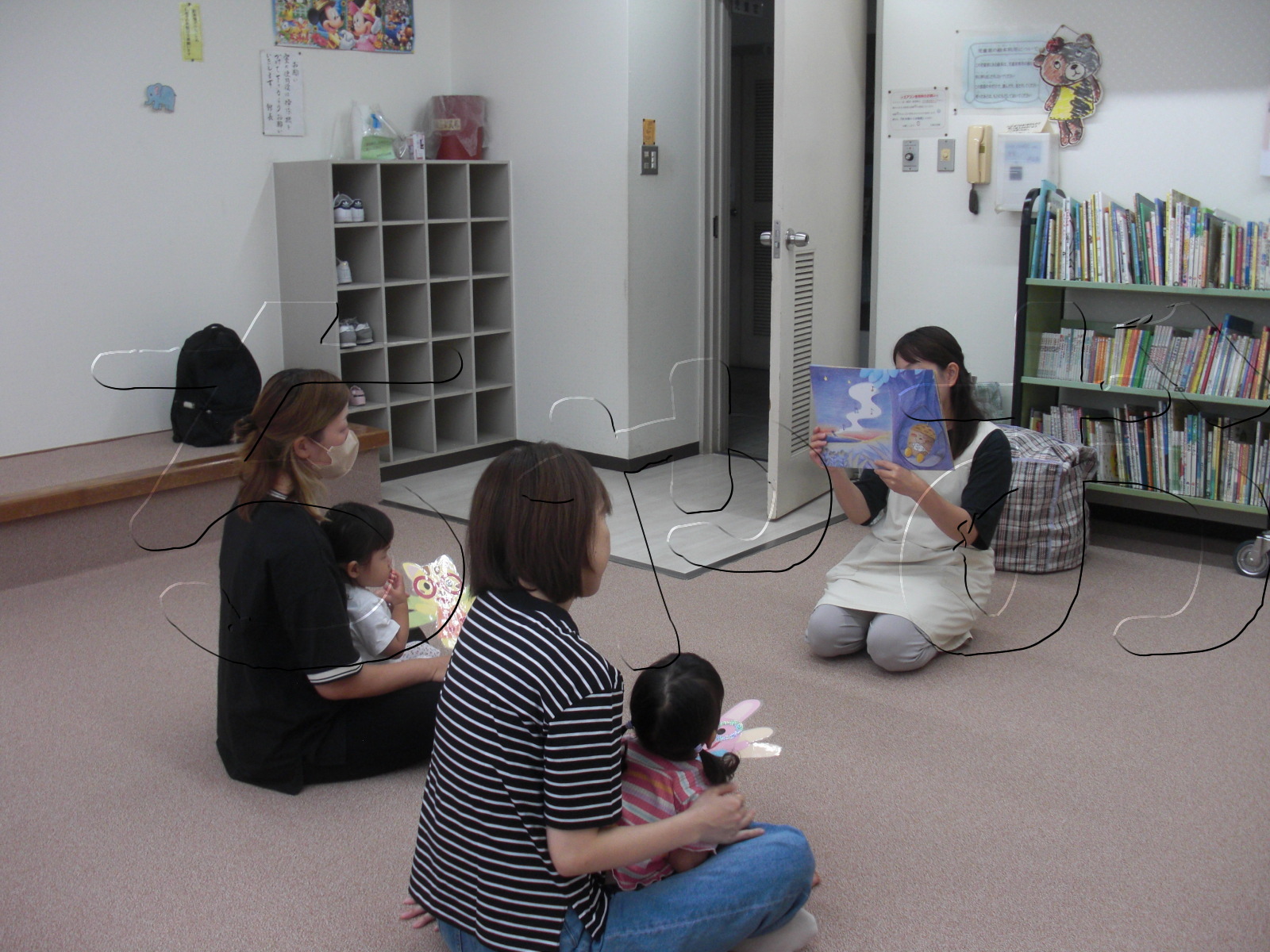午後は「だっこひろば」でした。6組の親子の方が遊びに来てくださいました。初めての方もおられましたが、皆さん和気あいあいとお話されていました。子ども達もお友達に興味津々でお互いに笑い合ったり、声を出してお話しようとしている風にも見えました。お帰りに、「がたんごとんがたんごとん」の絵本を読みました。にこにこしながら聞いてくれていました。