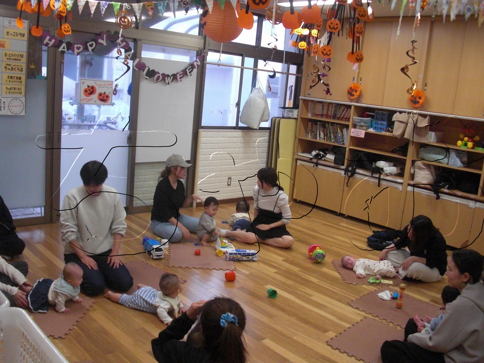 午前は「おいでよ!English」でした。11組のおやこの方が参加してくれました。初めてのお友達もいました。手遊びや身体を動かしたり、ハロウィンのぬりえやハロウィンのお話を読んだりといろんなカリキュラムで楽しまれていました。ベビーシャークのお歌は知っているお友達も多くて喜んでいました。「トントントン」ととびらを開くと素敵なプレゼントもあってみんなとっても嬉しそうでした。