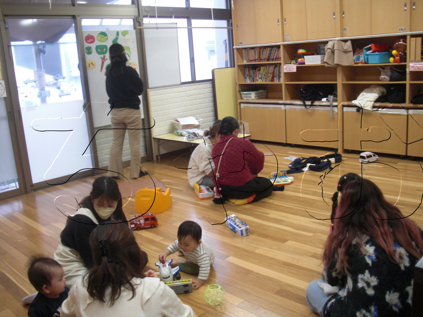 午後は「ほっとメイトひろば」でした。4組の親子の方が遊びに来てくれました。Nobuko先生と編み物を楽しまれているお母さんもいました。おともだちも様子を見ながら傍で遊んでいました。自分で車を動かしたり、つみきで遊んだりしていました。少し大きいお友達は、リモーザ知育玩具で形を作ったり、お母さんに真似っこしてと伝えて同じようにパーツをはめてもらって楽しんでいました。