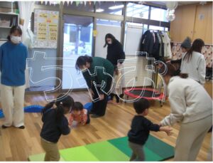 午前は、「ぱんだクラス8回目でした。今日は秋コース最後となりましたが、お休みのお友達もいなくて、全員参加でした。クリスマスの手遊びやパネルシアターをしたり、ダンスや雪だるまのパネルたおしなどもしました。体操もひとりで踊ってくれたり、身体の部位を触ったりとみんな、身体を動かすのを楽しんでくれていました。お母さんたちとの交流の時間では、悩みやお母さんたちの好きなことなどをお話してもらいました。